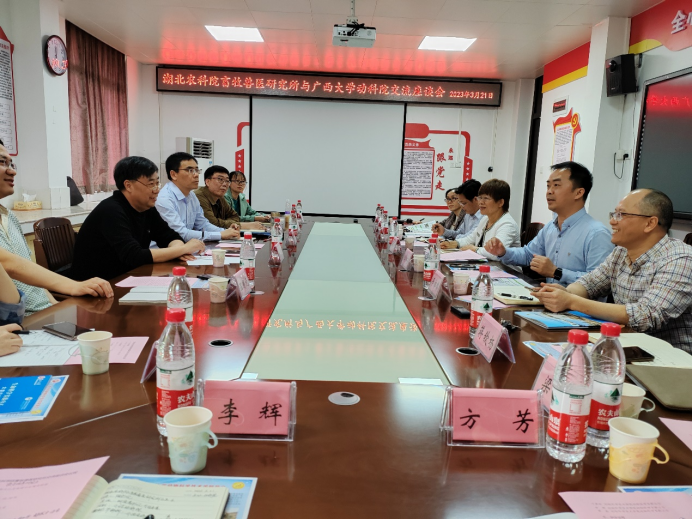 在何副院长介绍完广西大学及乐动(中国)概况之后,副所长毕延震和温国元简要介绍了湖北农科院畜牧兽医研究所的概况、现状及发展。湖北省农科院畜牧兽医研究所成立于1958年,一直致力于畜禽品种选育、畜禽疫病诊断与防控等方面的研究,有瘦肉猪育种、动物营养、兽医等专业研究室6个,建立国家家畜工程技术研究中心、湖北省动物疫苗工程技术研究中心等国家级和省级科研平台8个以及综合试验示范基地1个,形成了养猪、家禽、兽医等优势和特色学科。两位副所长还着重介绍了研究所的人才队伍建设,国家级和省部级科研项目以及经费情况,在科技奖项、畜禽品种培育及论文发表方面的成果,国家级和省级科研平台及院企共建情况,科技创新和成果转化情况、人才结构特点和在人才引培上遇到的问题,强烈希望我院今后输送高水平博士毕业生到研究所就业,并希望与我院开展研究生联合培养。随后,温国元副所长还介绍了兽医研究室的概况和自己在高效新型畜禽耐热活疫苗研究开发上取得的重要成果,吴俊静研究员和陈芳副研究员分别简要介绍了猪育种研究室和动物营养研究室的基础和应用研究状况以及取得的成果。