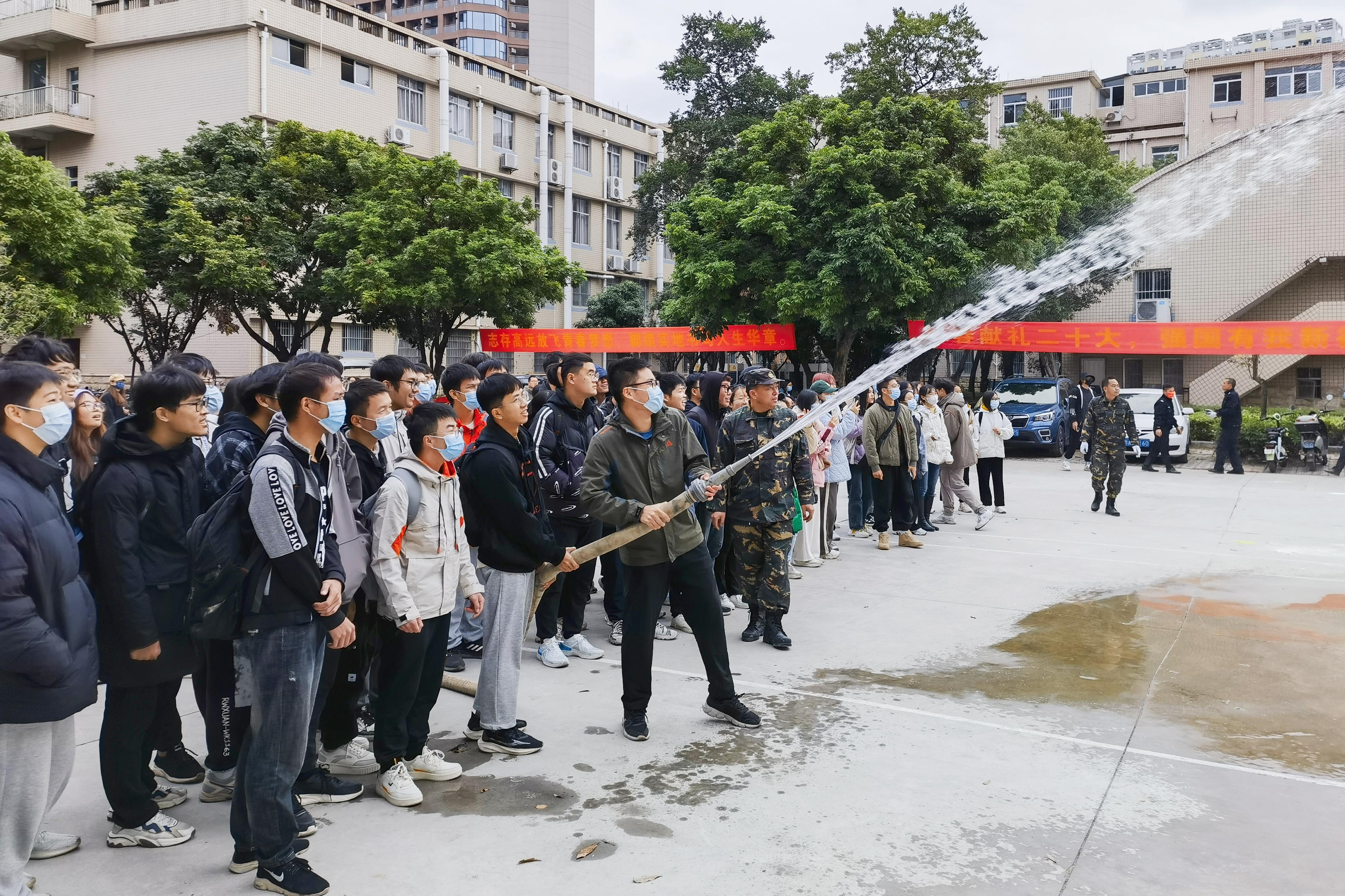 之后,同学们在现场进行了灭火器、消防水带的操作演练。