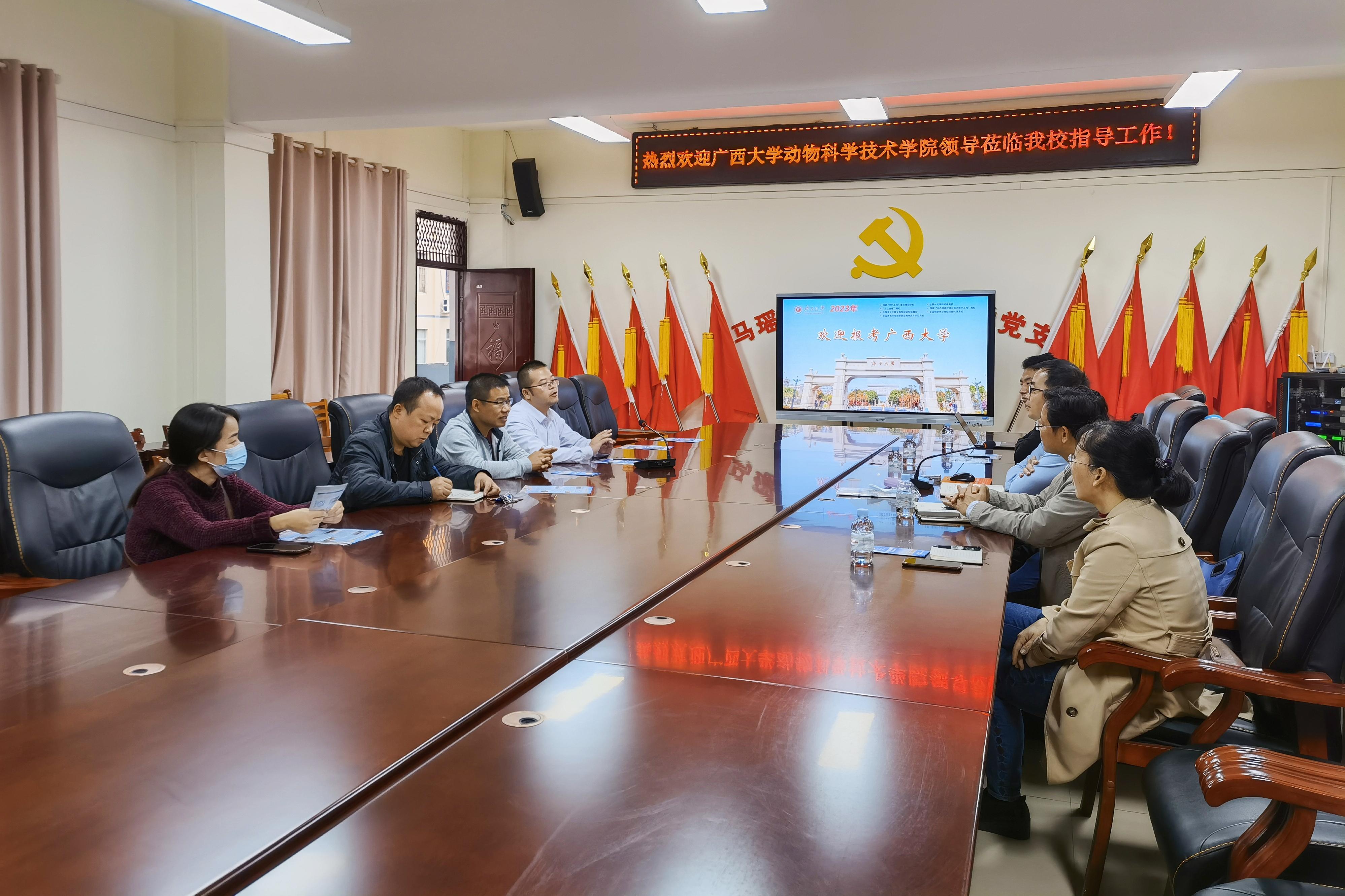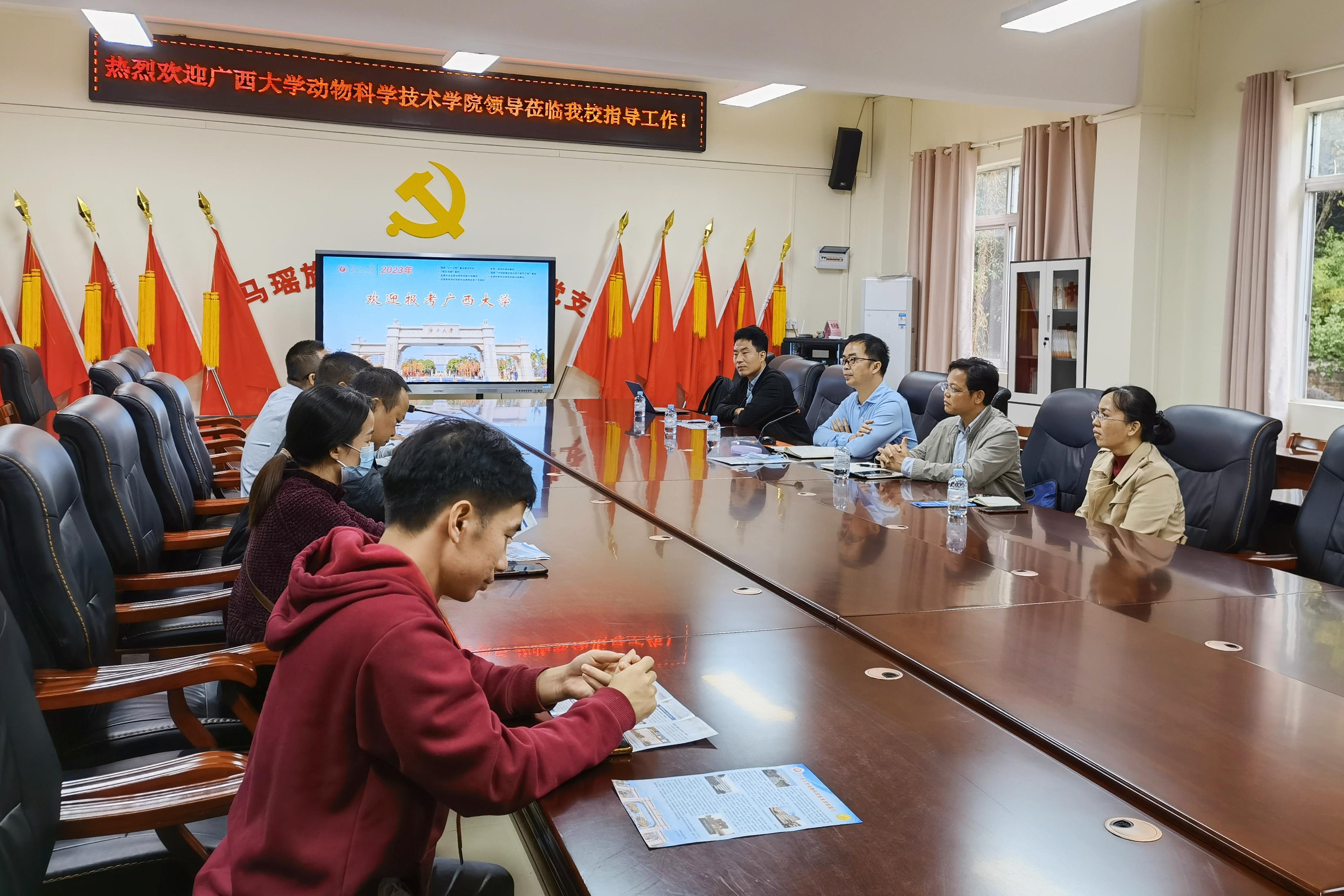 为进一步加大学校招生宣传力度,加强与区内优质中学的沟通联系,11月24日至25日,乐动网页版登录入口常务副院长陆阳清,副院长何家康,动物医学系主任陈樱,动物科学系副主任李辉,团委副书记刘诚先后走访都安瑶族自治县高级中学、巴马瑶族自治县高级中学、凤山县高级中学等3所自治区示范性普通高中。