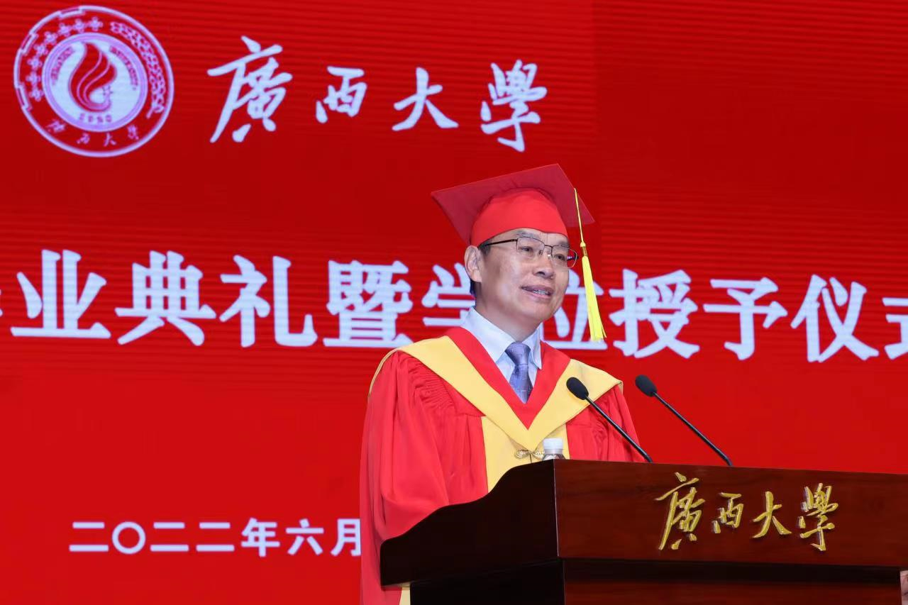 韩林海校长强调,人生因奋斗而精彩,青春因拼搏而亮丽,希望同学们继续传承和弘扬“勤恳朴诚”的校训和“创新创造、奋勇争先、全面一流”的广西大学“双一流”精神,在新时代的新天地中施展抱负、勇毅笃行,争当伟大理想的追梦人。他表示,母校永远是同学们的温馨家园和坚强后盾,母校永远牵挂同学们、支持同学们、祝福同学们。