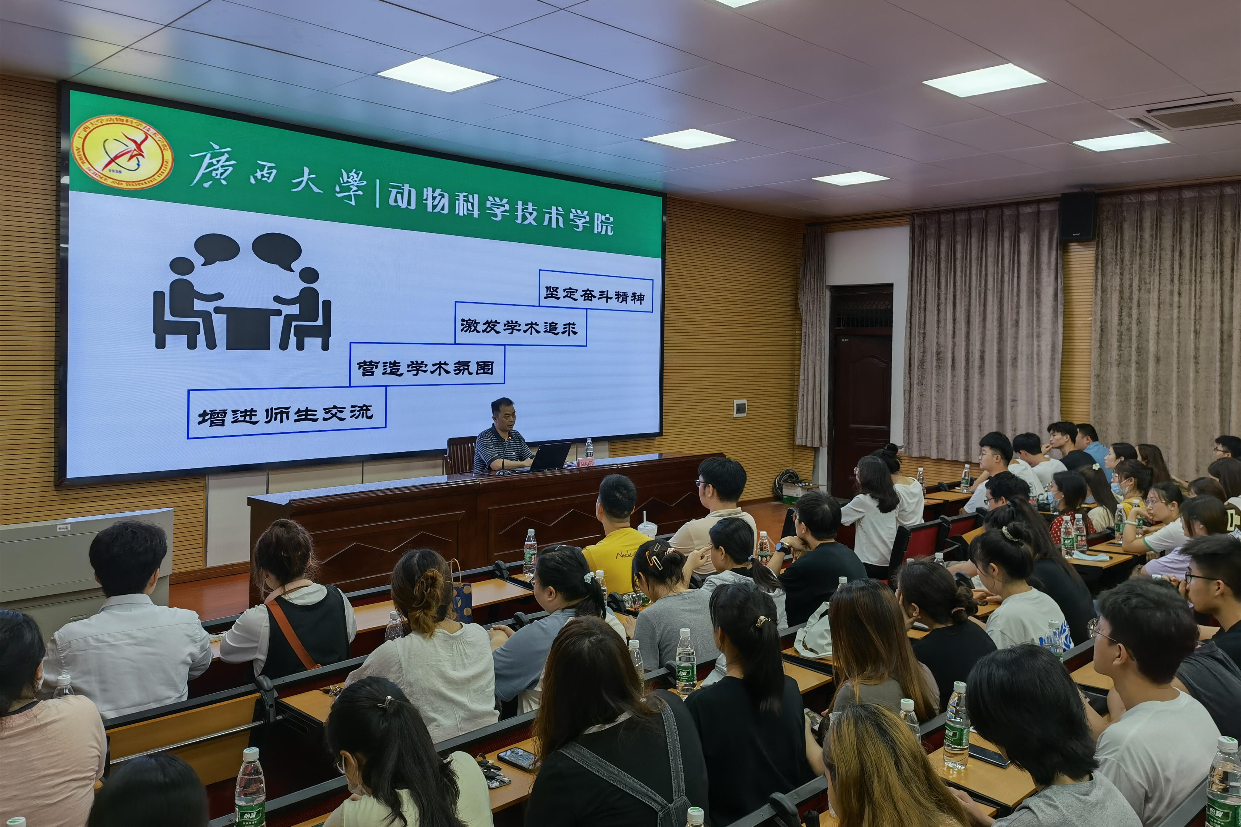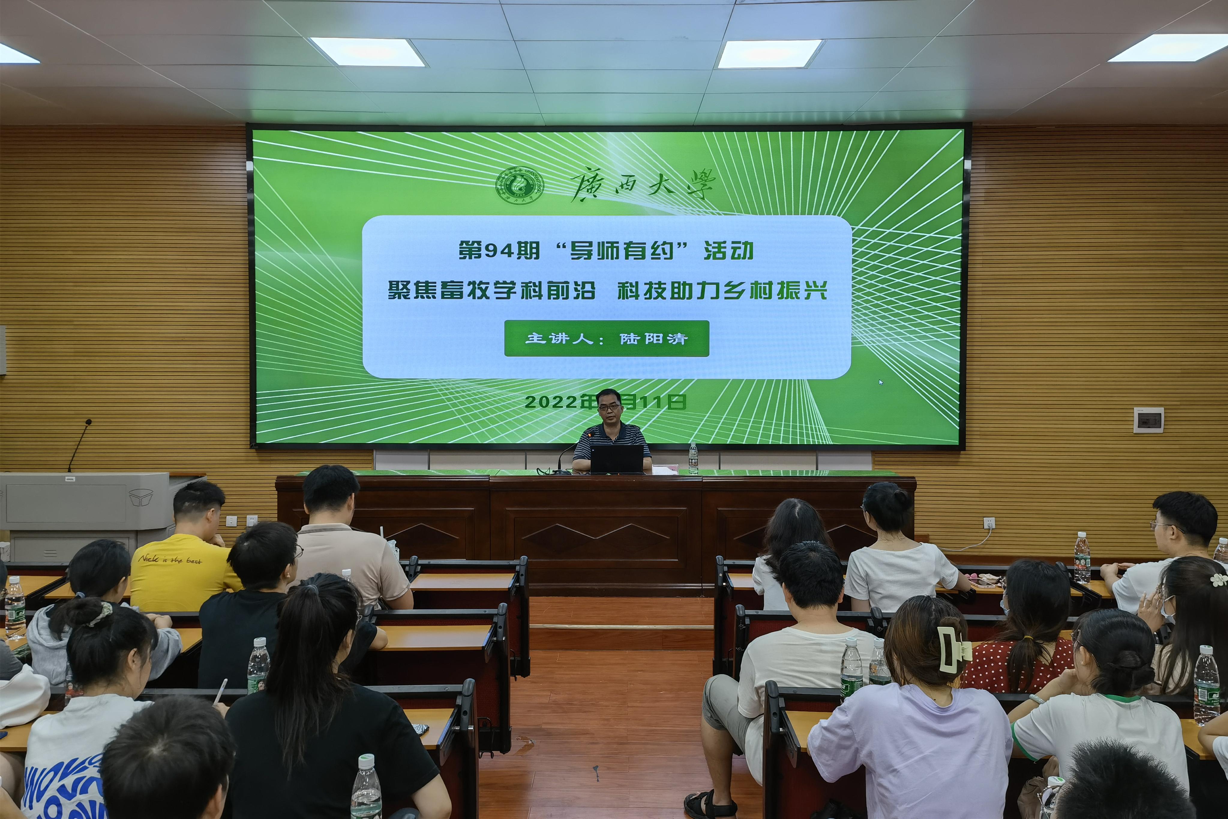 6月11日晚上,广西大学第94期“导师有约”活动在乐动(中国)318报告厅举行,主题为“聚焦畜牧学科前沿,科技助力乡村振兴”,乐动(中国)常务副院长、教授、博士生导师陆阳清受邀主讲。乐动(中国)团委副书记刘诚,以及2021级畜牧学、畜牧专业全体硕士生参加此次活动。