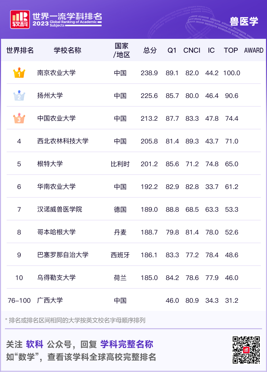 10月27日,高等教育评价专业机构软科正式发布2023“软科世界一流学科排名”,其中广西大学的兽医学学科跻身世界前100,位居第76-100名。