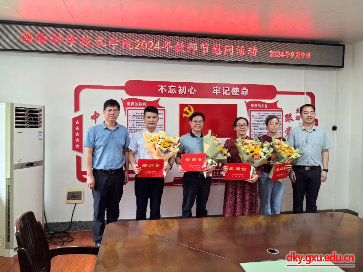 9月9日上午,乐动(中国)党委书记韦小强,院长陆阳清代表学校慰问教职工代表何家康、陈樱、许惠艳和庄站伟四名老师,为他们送上鲜花和慰问金,向他们致以节日的祝贺,并通过他们向全院教师致以节日的祝福,希望全院教师要牢记习近平总书记关于争做“四有 ”好老师的谆谆教导和殷殷嘱托,践行为党育人为国育才的初心使命。要自觉提升道德修养、人格品质,以德立身、以德立学、以德施教、以德强能,把正确的价值观传授给学生,帮助学生把握好人生方向。要弘扬教育家、科学家精神,提升教学质量和科研能力,争做业务先锋,争当工匠之师,努力培养德智体美劳全面发展的社会主义建设者和接班人。慰问活动由副院长蒋钦杨主持。