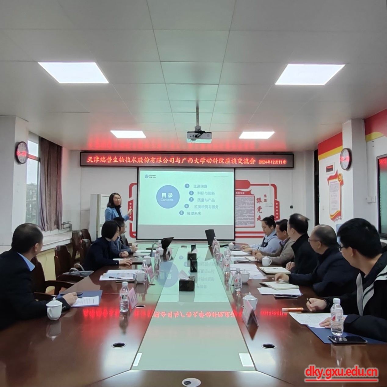 12月11日上午,天津瑞普生物技术股份有限公司副总裁兼高级工程师刘爱玲女士一行四人到我院造访,乐动(中国)院长陆阳清教授、副院长何家康教授、副院长韦祖樟教授及相关教师热情接待并在学院302会议室进行座谈交流。