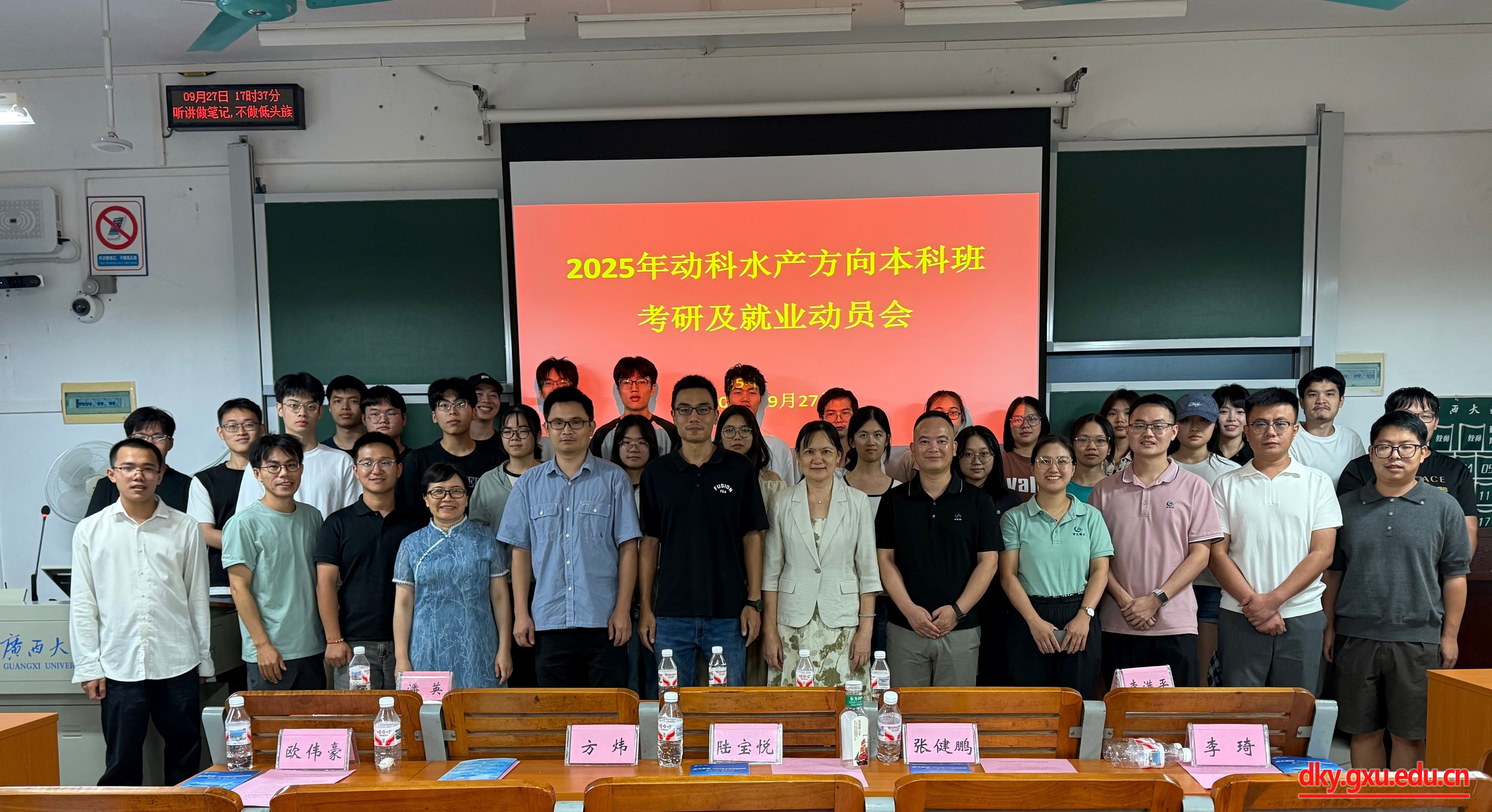 9月27日,广西大学动物科学专业水产养殖方向考研及就业动员会在东六教6A-228顺利召开。海大集团北部湾片区人力总监李满平,湛江海大人事经理曹春玲,技术服务高级工程师于杰,湛江容大人事主管钟一民,乐动(中国)水产学科带头人潘英,动物科学系副主任黄洁萍、水产学科专任教师以及本科生和研究生参加了此次会议。会议由水产方向第一个本科班“动科224班”班主任欧伟豪老师主持。