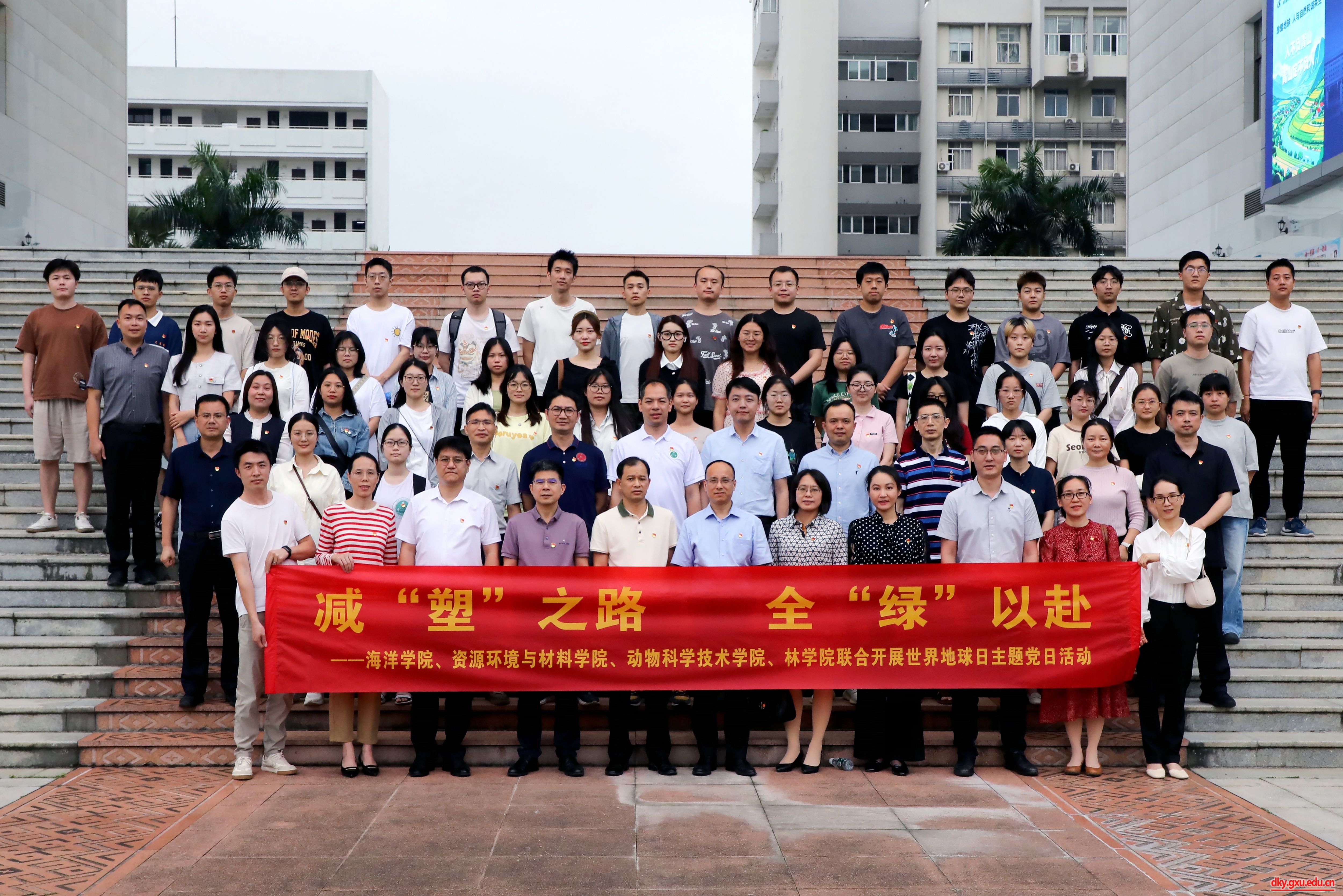 2024年4月22日是第55个世界地球日。为深入贯彻落实习近平生态文明思想,筑牢生态优先、绿色发展理念,4月22日,海洋学院、乐动(中国)、资源环境与材料学院、林学院党委在综合实验大楼联合开展“‘减’塑之路 全‘绿’以赴”主题党日活动。海洋学院党委书记秦华东,资源环境与材料学院党委书记沈大强,林学院党委书记符韵林,乐动(中国)党委副书记沙建,以及70余名师生党员代表参加此次活动。