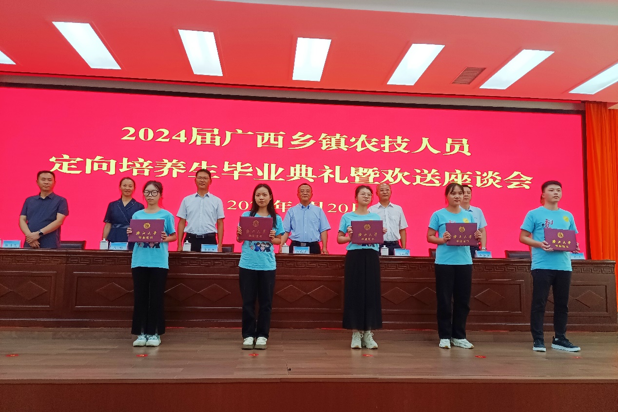 据悉,广西乡镇农技人员定向培养计划从2020年开始实施,截至目前累计招录乡镇农技人员定向生566人,其中本科生184人、专科生382人,为基层培养储备了一批专业技术人才。农技定向培养生学习期间享受“三免一补”政策(免除学费,免缴住宿费、免教材费,补助生活费),毕业后将扎根基层,积极开展技术示范推广、指导服务,为保障粮食和重要农产品稳产保供、推进乡村振兴发挥重要支撑作用。