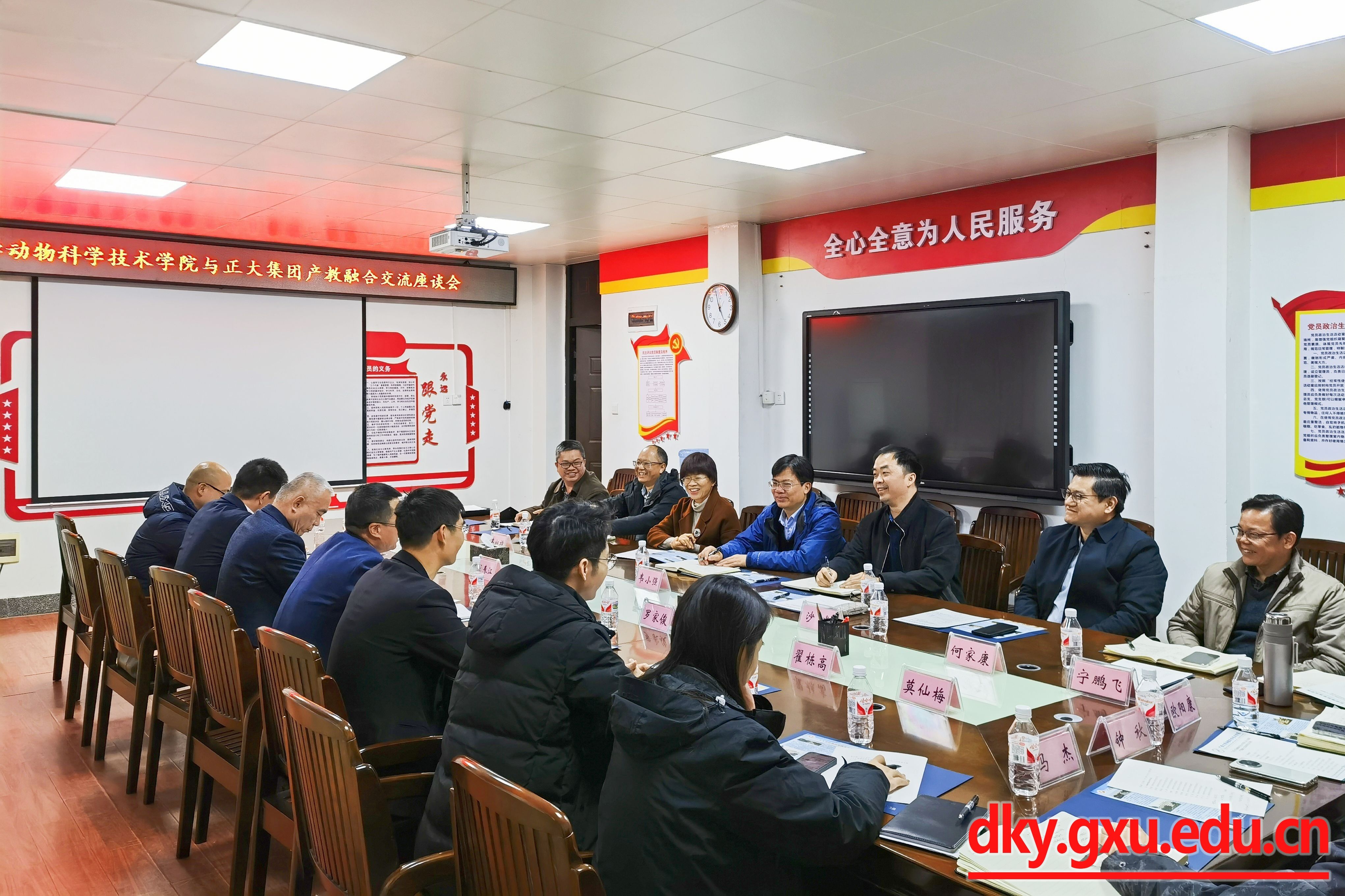 为进一步加强专业学科建设,提升人才培养质量,推动校企深度合作,12月16日下午,乐动网页版登录入口与正大集团在学院302会议室召开产教融合交流座谈会。乐动(中国)党委书记韦小强,院长陆阳清,原党委书记顾慕娴,党委副书记沙建,副院长何家康、韦祖樟、宁鹏飞,团委副书记刘诚,专任教师黄伟坚、欧阳康、钟秋、马杰,正大集团广西区总裁赖平生,广西区养殖事业副总裁王春江,广西正大畜禽有限公司总经理罗家俊,正大饲料(广西)南宁分公司总经理马春庆,正大集团华南区人力资源总监翟栋高,广西区兽医总监赵日浪,正大饲料(广西)南宁分公司人力资源主管莫仙梅参加此次会议。