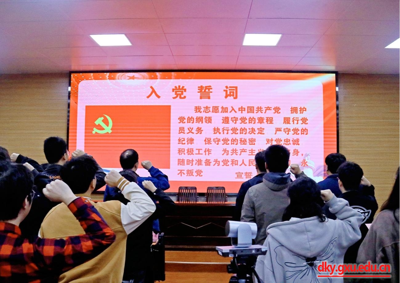 为深入学习贯彻习近平新时代中国特色社会主义思想,强化党员的思想教育,履行入党程序,1月16日上午,乐动(中国)在学院318报告厅举行预备党员宣誓仪式。乐动(中国)党委书记韦小强,党委副书记、院长陆阳清,党委副书记沙建,党委委员、副院长宁鹏飞,党委委员、副院长何家康,团委书记李丽娜,团委副书记刘诚,辅导员彭可可、马朝阳,以及2023年下半年新发展的预备党员和第54期预备党员培训班全体学员参加入党宣誓仪式,本次宣誓仪式由辅导员彭可可主持。