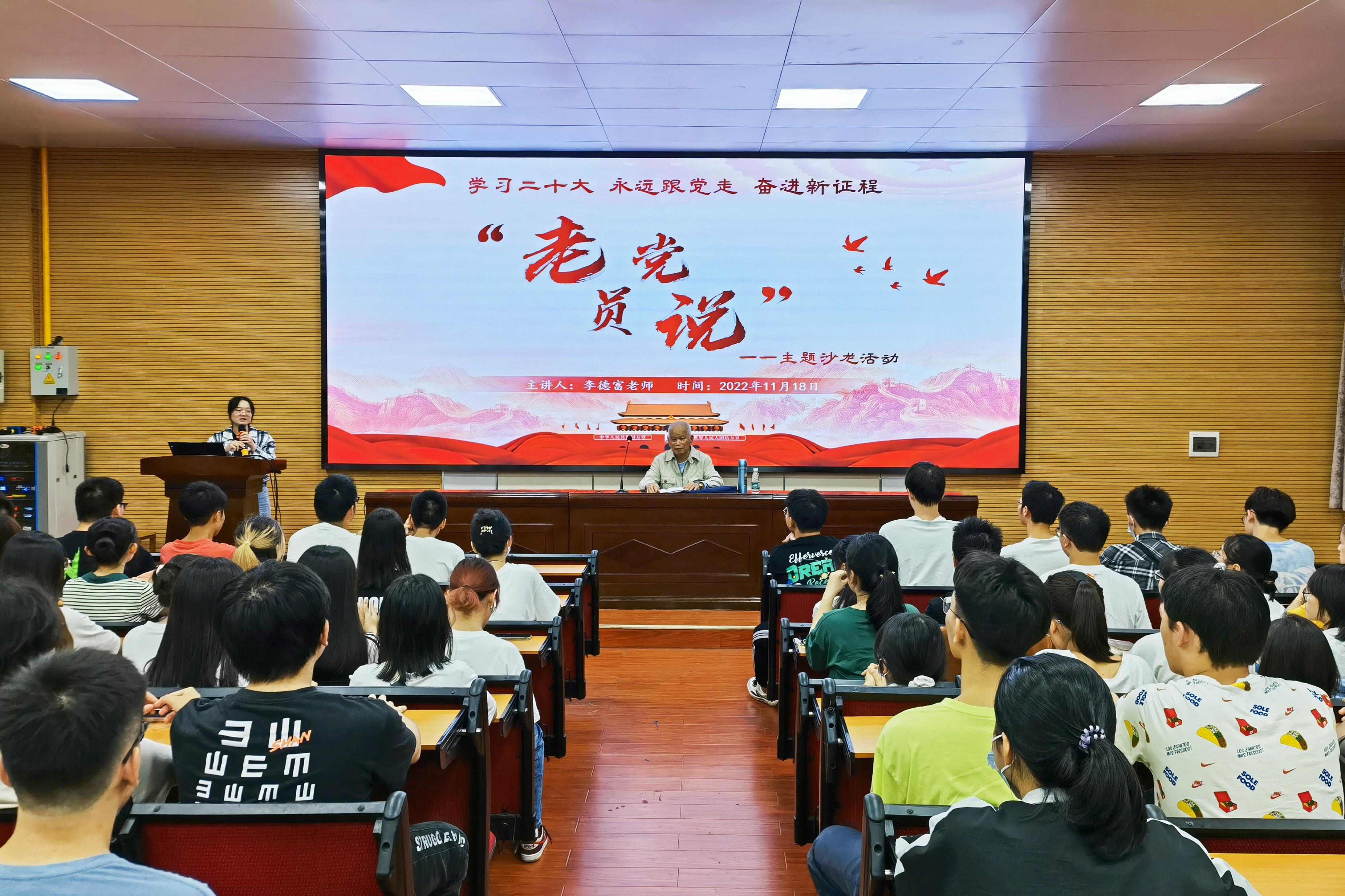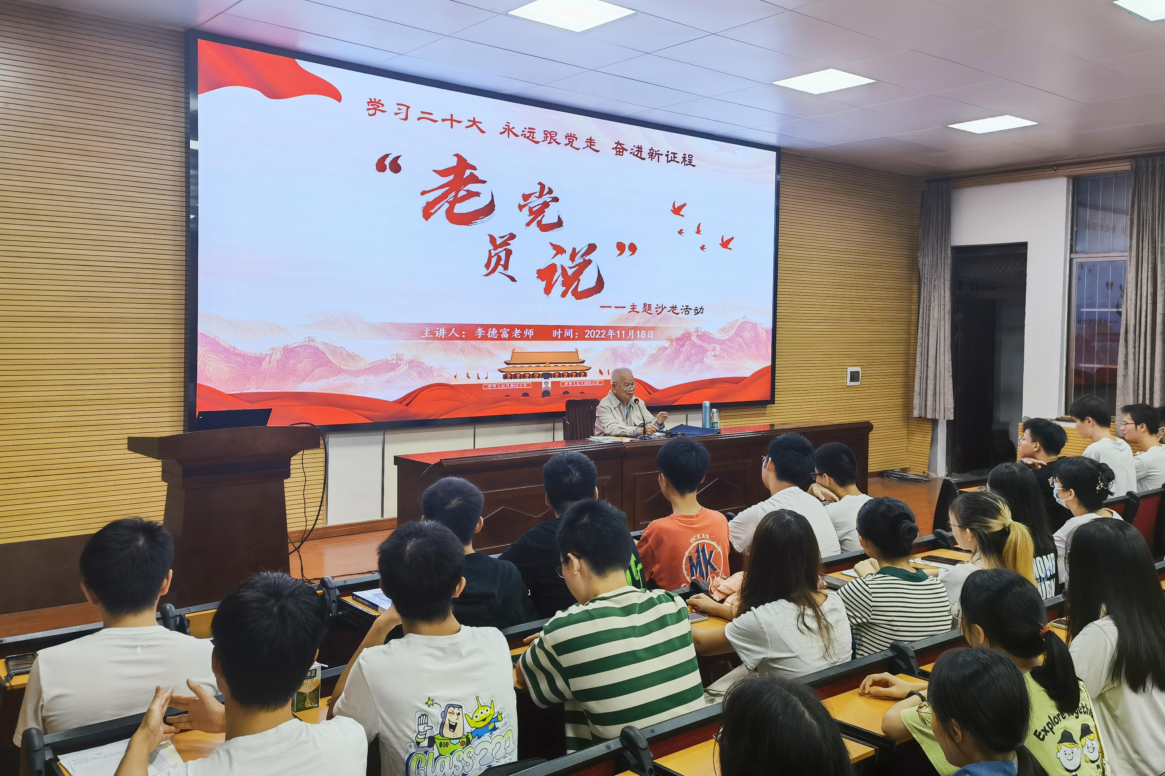 为更好地引领广大团员青年“向英雄学习、向前辈学习、向榜样学习”,推进党史学习教育常态化、长效化,11月18日晚上,乐动网页版登录入口在学院318报告厅举办第二期“老党员说”主题沙龙活动。乐动(中国)关心下一代工作委员会原副主任、退休老党员李德富教授受邀主讲。乐动(中国)团委书记李丽娜,团委副书记刘诚,辅导员韦春丽,以及全体2022级本科生参加此次活动。