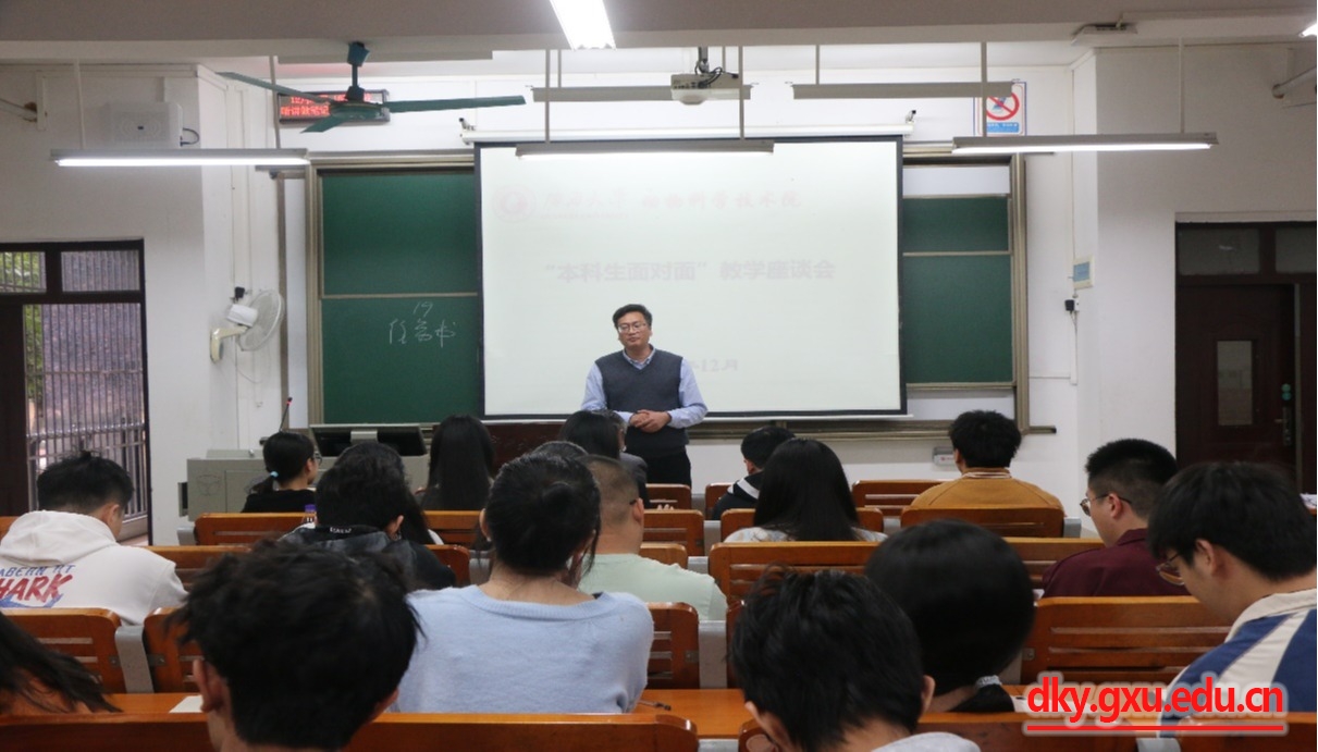 教学秘书覃志彪、马莉莉老师分别简要介绍了毕业论文、导师制课程、教学计划以及广西大学普通本科生教学管理规定,涵盖了各类课程修读要求、选课和退课、创新创业实践学分、推荐免试研究生等内容。