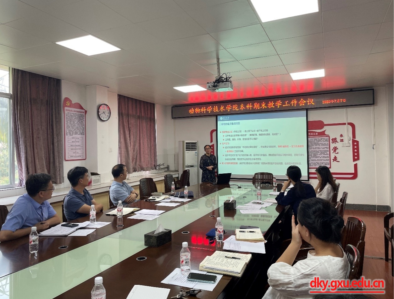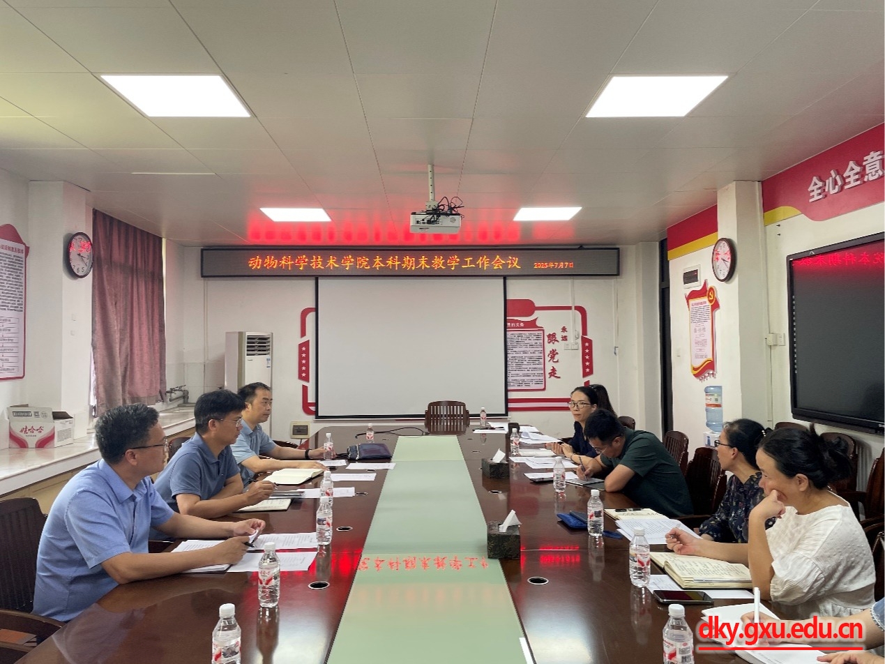 7月7日下午,乐动网页版登录入口2025年春季学期期末教学工作会议在院302会议室顺利召开。动物科学技术学院党委书记韦小强,院长陆阳清,副院长蒋钦杨,各基层教学组织负责人、学工组、教学办工作人员等参会。会议由蒋钦杨副院长主持,围绕本科教学核心工作展开深入研讨与部署。