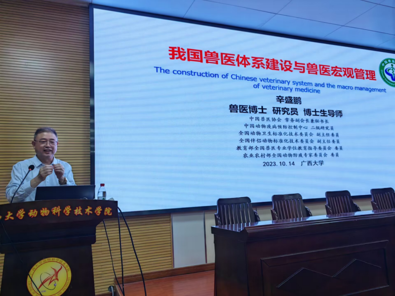 2023年10月14日上午,在乐动网页版登录入口318报告厅,中国动物疫病预防控制中心原副主任、中国兽医协会副会长兼秘书长辛盛鹏研究员应邀为广大师生做了一场主题为“我国兽医体系建设与兽医宏观管理”的报告。广西大学副校长罗廷荣教授主持报告会,会场近300个座位座无虚席。