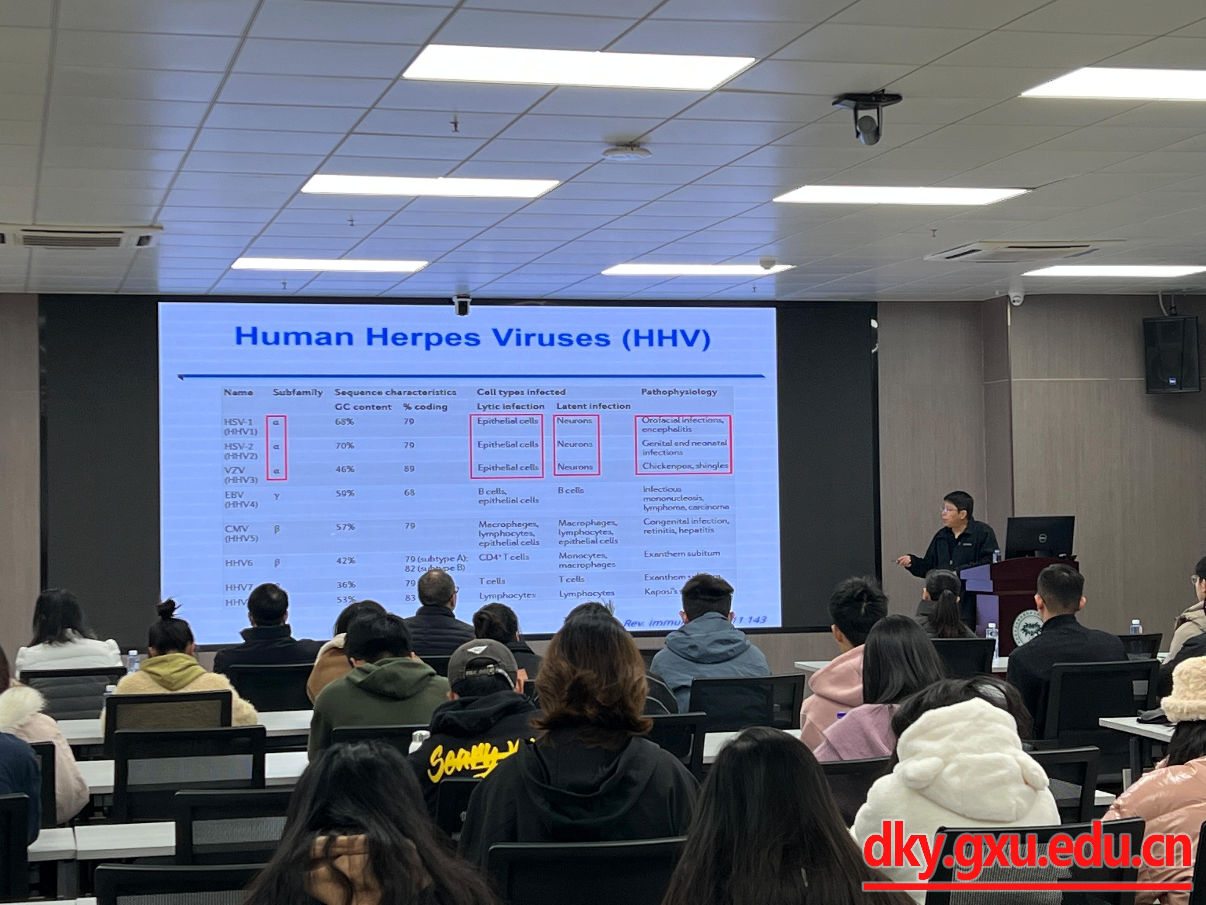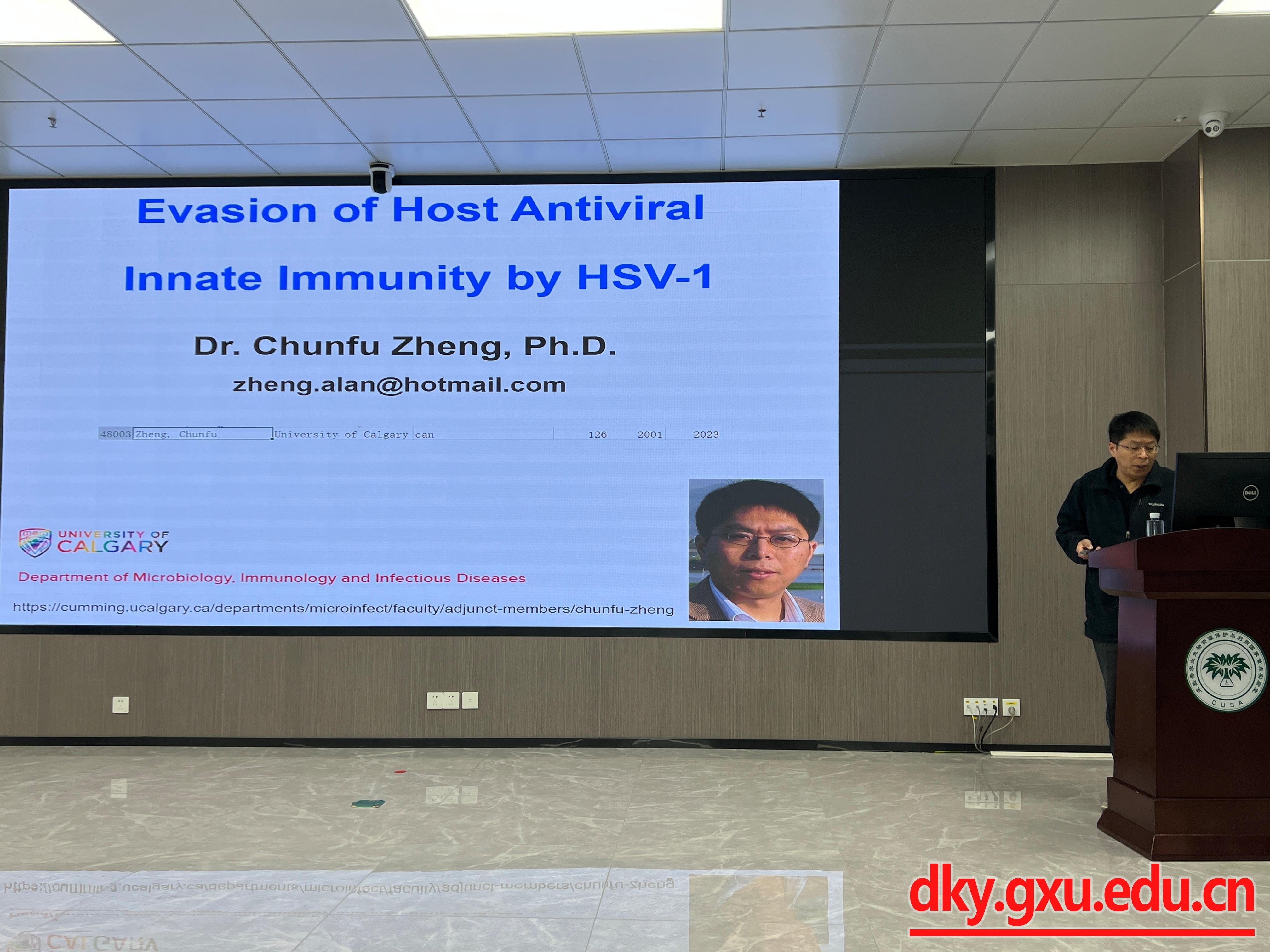 12月22日上午,加拿大卡尔加里大学郑春福教授在广西大学国家重点实验室107会议室作题为 “Evasion of host antiviral innate immunity by HSV-1”的学术报告。报告会由乐动(中国)副院长韦祖樟教授主持,乐动(中国)磨美兰教授、韦天超副教授、欧长波副教授等教师以及100多名师生参加报告会。