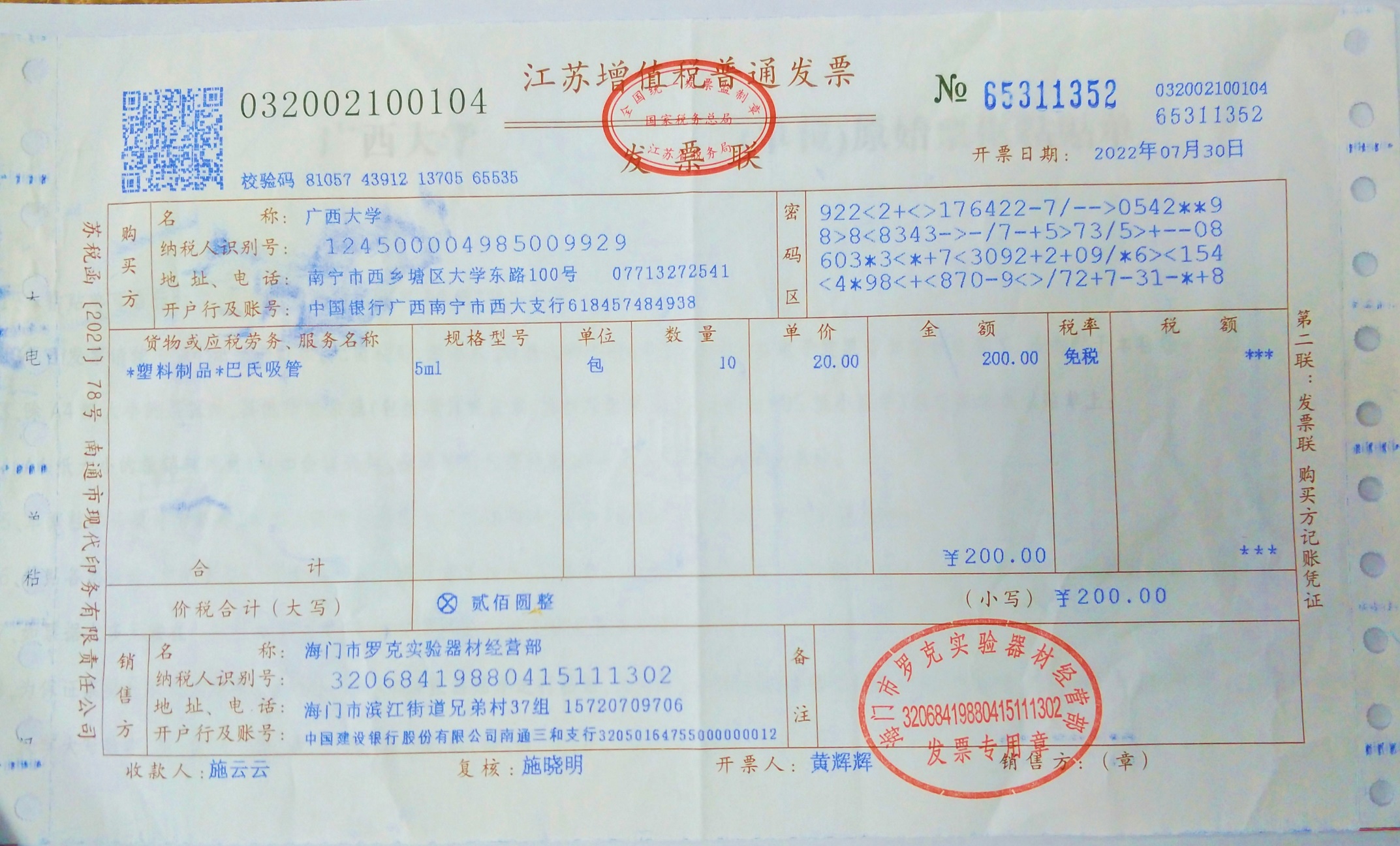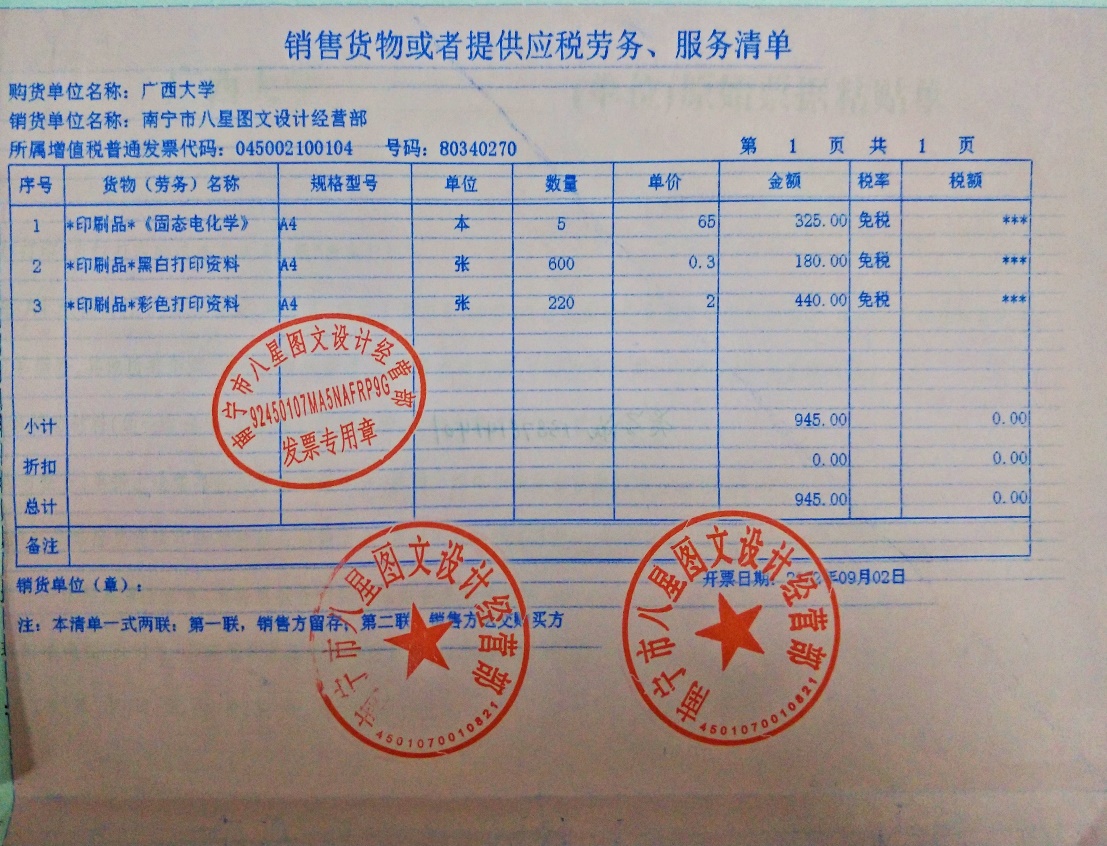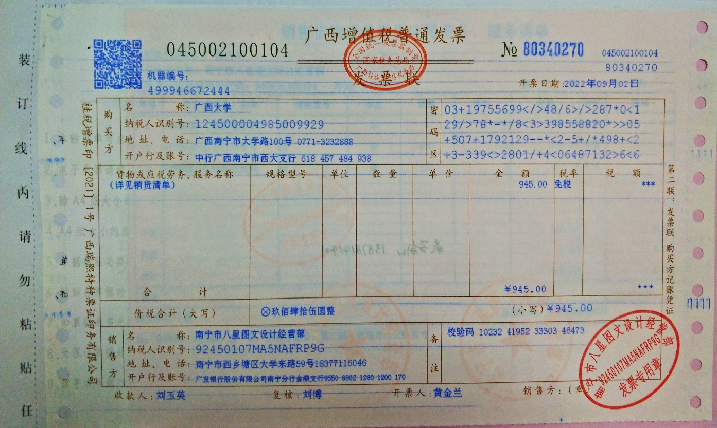 注意:特殊业务外,发票抬头不能写个人名字或广西大学XX学院。